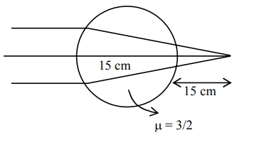 Q. A parallel beam of light is allowed to fall on a transparent spherical globe of diameter and refractive index . The distance from the centre of the globe at which the beam of light can converge is ______.