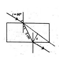 Q. A ray of light enters a rectangular glass slab of refractive index at an angle of incidence It travels a distance of inside the slab and emerges out of the slab. The perpendicular distance between the incident and the emergent rays is