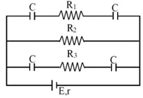 In the adjoining circuit diagram, E=5V , r=1Ω , R2=4Ω , R1=R3=1Ω and C=3mF . Then the numerical value of the charge on each plate of the capacitor is