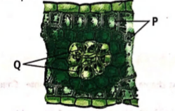 The given cross section of the leaf represents Kranz anatomy in a C4 plant. P are the chloroplasts of mesophyll cells, which are granal (/.a, thylakoids are stacked to form grana) j and are specialised to perform light reaction of photosynthesis, evolve O2 and produce assimilatory power (ATP+NADPH2). Q are the chloroplasts of bundle sheath cells which are agranal, i.e., grana are absent and the thylakoids occur as stroma lamellae. In these chloroplasts, final fixation of CO2 takes Ptace through Calvin cycle where CO2 is fixed by RuBP in the presence of enzyme RuBisCO.