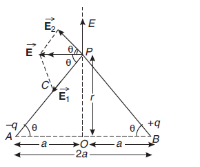 As shown in figure, on equatorial line, the resultant electric field of and is parallel to the axis of the dipole but opposite