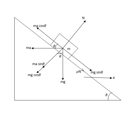 Now resolving the components of different forces acting on the block N=mgcosθ+masinθ...............(2)macosθ=mgsinθ+μN..............(3)